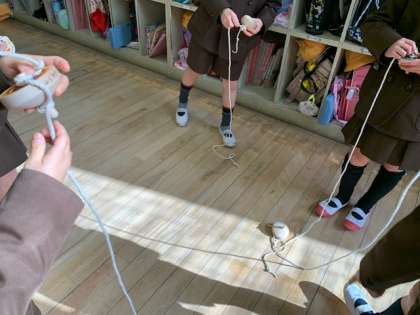 1年生は生活科の学習で昔遊びの体験をしています。木のコマに自分で色を塗ったものを回して楽しく遊びました。