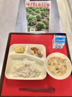 上段の写真は、本日の給食のサンプルと給食図書です。本日の給食図書は、「たくさんのふしぎ くりばやし」でした。若い栗の林がだんだんと生い茂っていく様子を捉えた写真絵本でした。