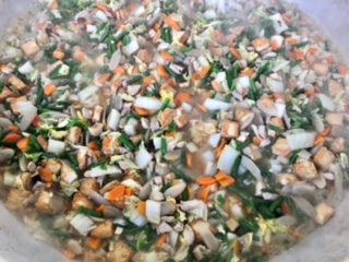 あつあげと野菜の煮ものは、けずりぶしで取っただしに、鶏肉、にんじん、ごぼう、あつあげ等が入った煮ものでした。