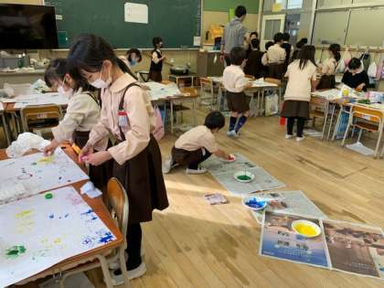 1年生は図画工作で「スタンプ スタンプ」という作品を作りました。家から野菜の切れ端やプリンカップ等を持ってきて絵の具を付け、画用紙に押していきます。1年生の子どもたちはいろいろ工夫しながら楽しい作品を作りました。