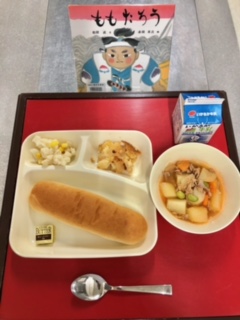 上段の写真は、本日の給食のサンプルと給食図書です。本日の給食図書は、「ももたろう」でした。桃太郎がサルやイヌ、キジを連れて鬼退治に行く昔話でした。