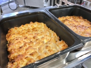 1月27日(水)の献立は、「コッペパン・バター・豚肉と野菜のケチャップ煮・カリフラワーのピクルス・桃のクラフティ・牛乳」でした。/The school lunch menu for Wednesday, January, 27th was "Bread Roll, Butter, Ketchup-Stewed Pork and Vegetables, Pickled Cauliflower, Peach Clafoutis".