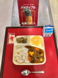 1月28日(木)の献立は、「牛肉と金時豆のカレーライス・ごぼうサラダ・パインアップル缶・牛乳」でした。