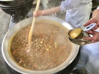 牛肉と金時豆のカレーライスは、牛肉、金時豆、にんじん、たまねぎ、じゃがいもが入ったカレーでした。ルウの中にはハート形のラッキーにんじんが入っていました。また、今日の牛肉は「大阪府国産農林水産物学校給食提供事業」の一環として、和牛の「近江牛」が使われました。
