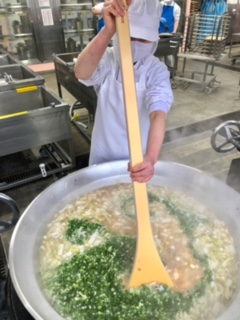下段の写真は、みそ汁を仕上げている様子です。