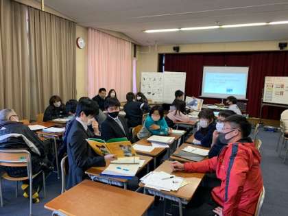 放課後には研究討議会と研修会を行いました。Robert先生からC-NETとティームティーチングを行う際の留意点を聞いたり、校長先生が講師になって英語絵本の読み聞かせのワークショップ研修をしたりしました。