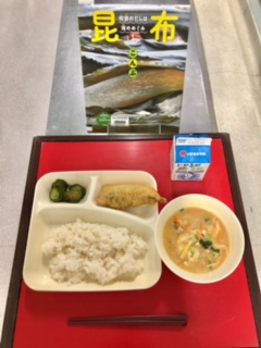 上段の写真は、本日の給食のサンプルと給食図書です。本日の給食図書は、「昆布」でした。