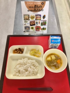 上段の写真は、本日の給食のサンプルと給食図書です。本日の給食図書は、「コトコト煮もの 混ぜ混ぜあえもの」でした。」でした。