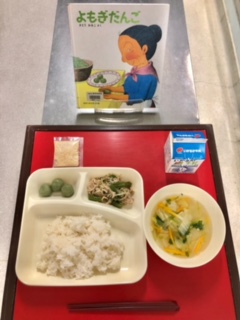 上段の写真は、本日の給食のサンプルと給食図書です。本日の給食図書は、「よもぎだんご」でした。