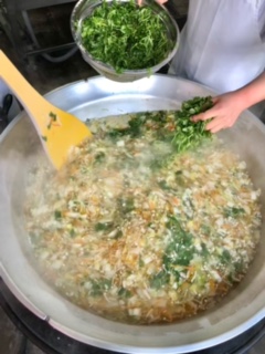 下段の写真は、みつばをちらして、すまし汁を仕上げている様子です。