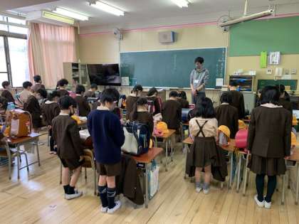 今日は大阪市教育委員会の指示で、大震災が起きたのと同時刻の14:46に全校児童で黙とうを捧げました。