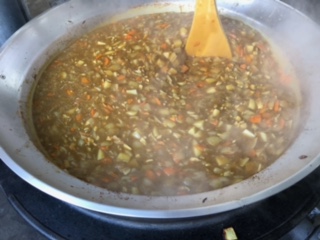 中段の写真は、チキンカレーを煮込んでいる様子です。