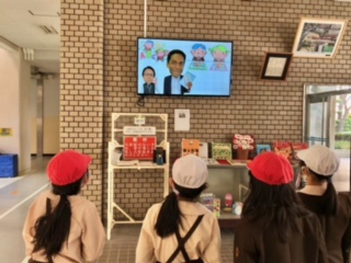 下段の写真は、外国人講師の先生(C-NET)と作成した、給食にまつわる英語の動画「English Channel for School Lunch」を放映している様子です。