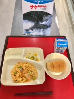 上段の写真は、本日の給食のサンプルと給食図書です。本日の給食図書は、「サケの観察事典」でした。