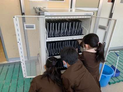 各学年とも「一人一台」パソコンにログインして充電し、今後の活用に備えました。