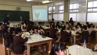 ゲストティーチャーには「鶴見はなぽーとブロッサム」から「花いちば」のスタッフの方々が来てくださいました。この「大阪鶴見花き地方卸売市場」は取扱量が東京に次いで全国2位の規模があり、毎年4月には鶴見区の全小学生に花の持ち帰りプレゼントでも大変お世話になっています。今日は3年生に向けて「一花一葉」をテーマに授業をしてくださいました。