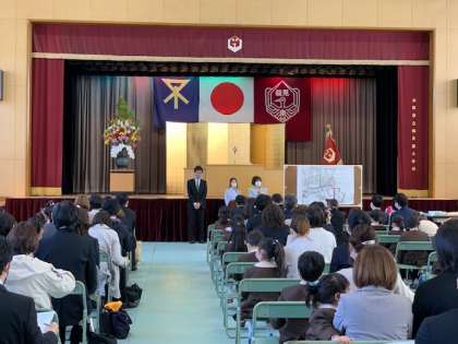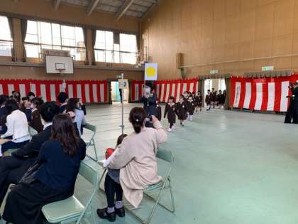 新1年生75名が小学校生活の第一歩をふみだしました。「※元気よくあいさつをしましょう。※友だちを大切にしましょう。※勉強をがんばりましょう。」との校長先生からの3つの話を1年生は真剣に聞くことができていました。校長先生の話を心に持ち続けて6年間がんばってほしいと思います。