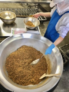 下段の写真は、出来上がった紅さけそぼろを配缶している様子です。