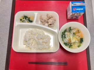 4月20日(火)の献立は、「ごはん・牛乳・鶏肉のからあげ・中華スープ・チンゲンサイともやしの甘酢あえ」でした。