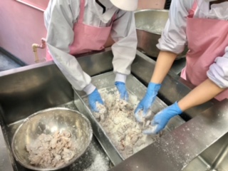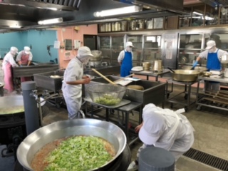中、下段の写真は、本日の調理風景です。給食調理員のエプロンは、調理中は白色、出来上がった給食を取り扱う場合は青色、肉・魚を扱う場合はピンク色等、エプロンの色で調理の役割を明確にし、衛生的に作業をしています。
