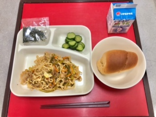 4月23日(金)の献立は、「黒糖パン(小)・牛乳・焼きそば・きゅうりのしょうがづけ」でした。/The school lunch menu for Friday, April, 23rd was "Black Sugar Bread(small size), Milk, Fried Noodles, Pickled Ginger Cucumbers".