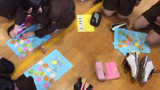 その後6年生だけ教室に戻り、明日にせまった「卒業をお祝いする会」で6年生に贈る寄せ書きの準備をしました。これも明日まで6年生にはナイショですが、手渡すのが楽しみですね。