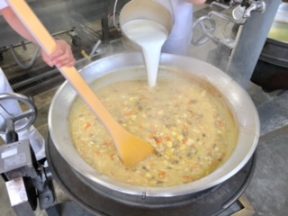 下段の写真は、コーンクリームシチューに牛乳を加えている様子です。