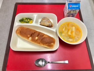5月20日(木)の献立は、「おさつパン・牛乳・かつおのガーリックマヨネーズ焼き・ベーコンと野菜のスープ・グリーンアスパラガスのソテー」でした。