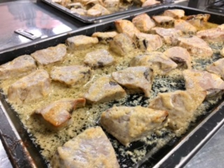 かつおのガーリックマヨネーズ焼きは、にんにく、塩、こしょう、マヨネーズで下味をつけたかつおを、焼き物機で蒸し焼きにした焼き魚でした。