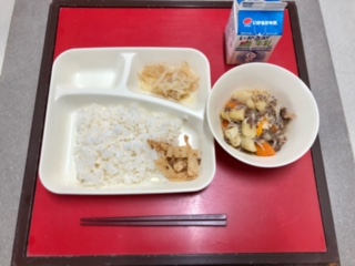 5月24日(月)の献立は、「ごはん・牛乳・肉じゃが・もやしのゆずの香あえ・ごまかかいため」でした。/The school lunch menu for Monday, May, 24th was "Steamed Rice, Milk, Meat and Potatoes, Yuzu-Dressed Bean Sprouts, Stir-Fried Sesame and Bonito Powder".