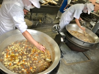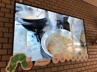 下段の写真は、本日の給食調理の様子を玄関で放映している様子です。