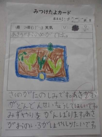 「さくのがたのしみです。あさがおがどんどんせいちょうしてほしいです。みずやりをがんばります。あさがおのいろがはやくしりたいです。」