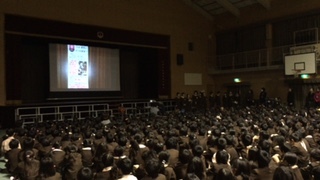 5年生はこれまで新聞を使っての学習を重ねてきました。今日は児童集会で、新聞に掲載されていた写真を拡大して見せて「これは何の場面でしょう。」と質問する内容でした。初めはネコがごはんを食べている写真でした。手を挙げて答えた児童は「ネコの誕生