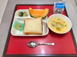 6月8日(火)の献立は「食パン(りんごジャム)・牛乳・かぼちゃのクリームシチュー・ミックス海そうのサラダ・クインシーメロン」でした。