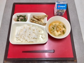 6月9日(水)の献立は、「ごはん・牛乳・いわしてんぷら・五目汁・豚肉とさんどまめのいためもの」でした。