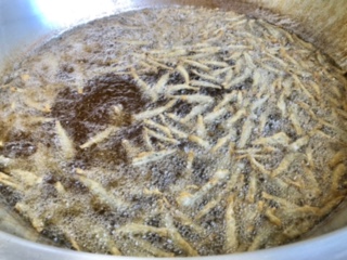 下段の写真は、いわしてんぷらを揚げている様子です。