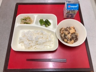 6月16日(水)の献立は「ごはん・牛乳・すき焼き煮・オクラのかつお梅風味・もやしとピーマンのごまいため」でした。