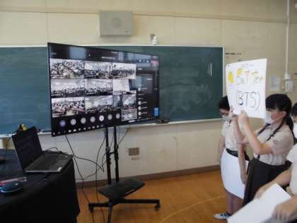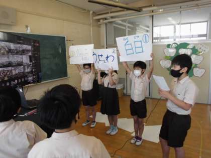 問題を出すと、各クラスの児童が指を挙げて答えている様子がモニターに映し出されました。