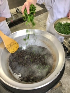 下段の写真は、牛ひじきそぼろに、あおじそを加えて、仕上げている様子です。
