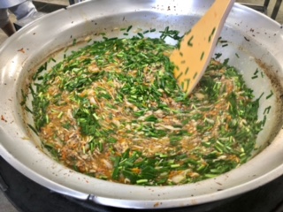 下段の写真は、最後ににらを加えて、マーボーはるさめを仕上げている様子です。