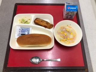 6月29日(火)の献立は「コッペパン(ブルーベリージャム)・牛乳・サーモンフライ・豆乳スープ・キャベツのソテー」でした。