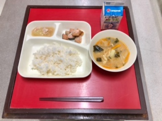 みそ汁は、だしこんぶとけずりぶしで取っただしで、にんじん、じゃがいも、あつあげ等を加えて煮、最後に合わせみそ、わかめを加えて仕上げた汁ものでした。