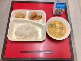 7月14日(水)の献立は「豚肉の香味あげ・みそ汁・もやしのおひたし」でした。