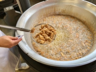 下段の写真は、豚肉を揚げている様子です。揚げた豚肉の中心温度を測定しています。
