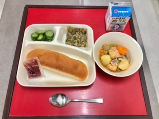 7月15日(木)の献立は「コッペパン(いちごジャム付き)・牛乳・もずく入りヒラヤーチー・豚肉とあつあげの煮もの・あっさりきゅうり」でした。