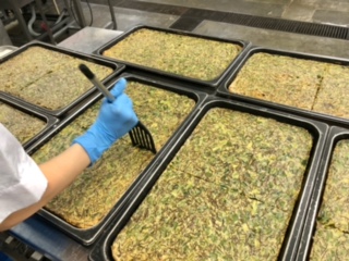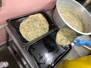 下段の写真は、焼き上がったヒラヤーチーです。これを一人分に切り分けて配缶しました。