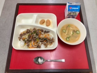 7月16日(金)の献立は「牛丼・牛乳・とうがんのみそ汁・白花豆の煮もの」でした。/The school lunch menu for Friday, July, 16th was "Japanese Beef Bowl, Milk, Wax Gourd Miso soup, Boiled White Beans".