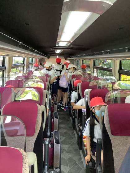 出発式前の集合の様子及びバスでの乗車の様子です。