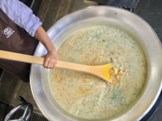 豆乳スープは、具ににんじん、たまねぎ、じゃがいも、コーン等を加えて煮、野菜ブイヨンや豆乳で味付けした汁ものでした。