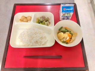 9月15日(水)の献立は「ごはん・牛乳・一口がんもとさといものみそ煮・牛肉と野菜のいためもの・みたらしだんご」でした。